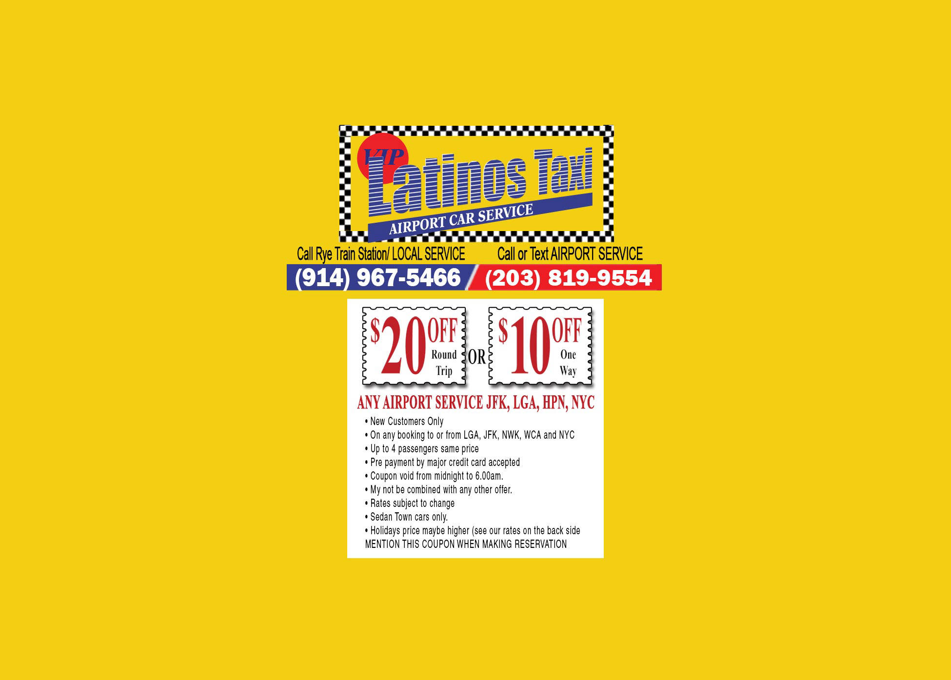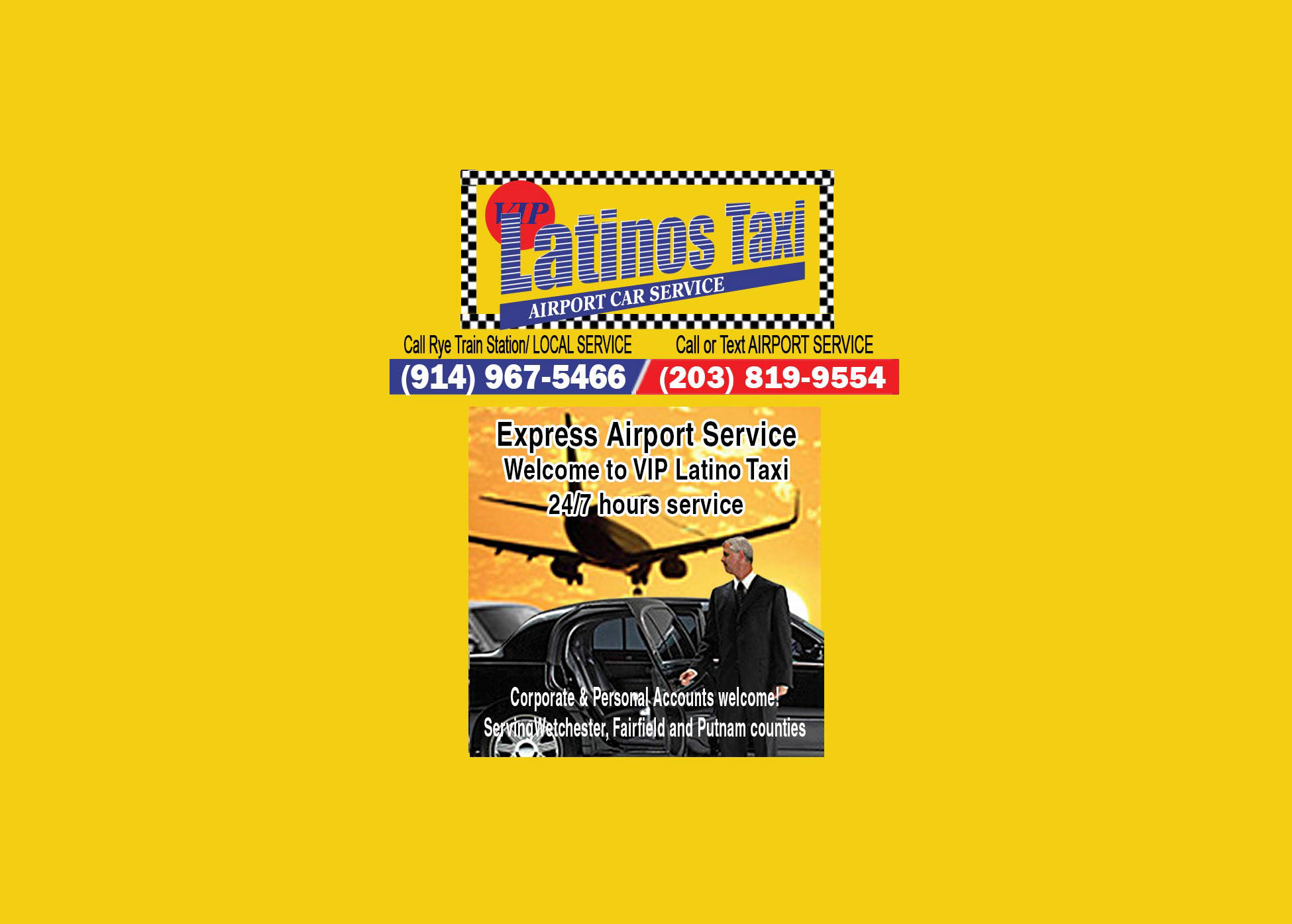 AIRPOIRT SERVICE VIP Latinos Taxi Limo specialize in Airport transfer serving all nearby major airports to/from: John F Kennedy International Airport (JFK) La Guardia Airpot (LGA) Westchester County Airport (HPN) Regional Airports Teterboro (TGB) Macarthur (ISP) Bradley (BDL) Stewart (SWF) and Private Jets With more than 25 years of experience in the industry, we have what it takes to give you the perfect ride to your destination without hassles.